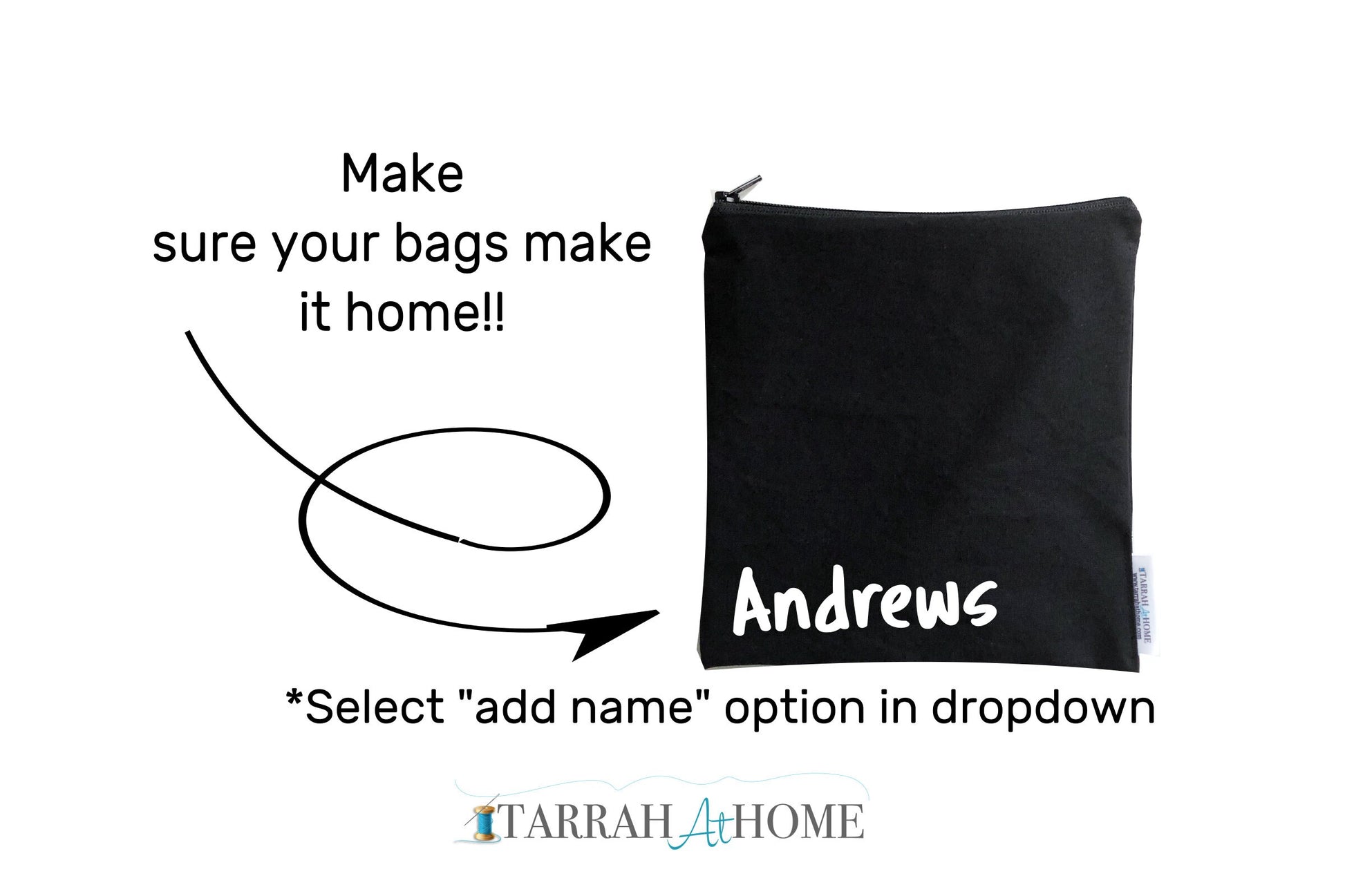 Bundle of 3 Personalized Black Print Reusable Snack Sandwich and Straw Bags