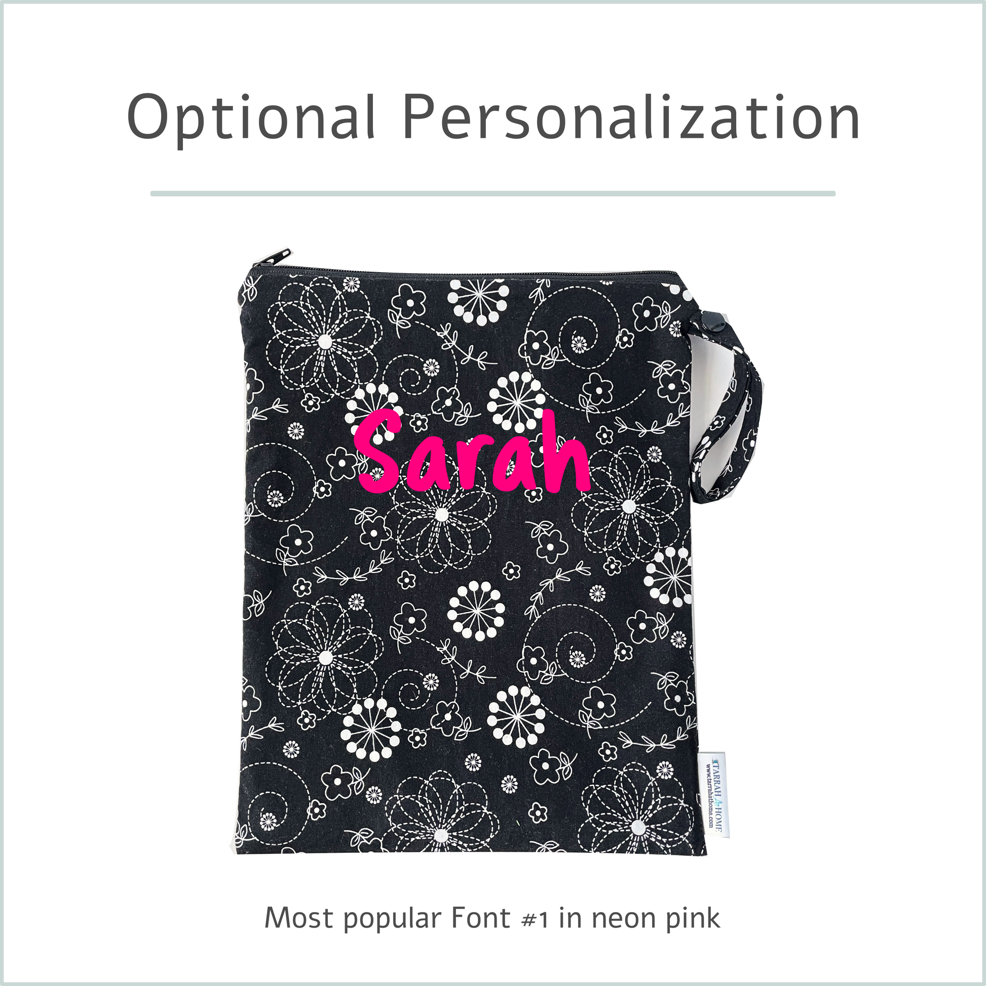 Personalization Optional personalization is available! Add a name (max 15 characters, first or family name) Applied using high-quality heat transfer vinyl in the upper middle of the bag Specify font & color in the personalization box. If none is provided, default is white, font #4.